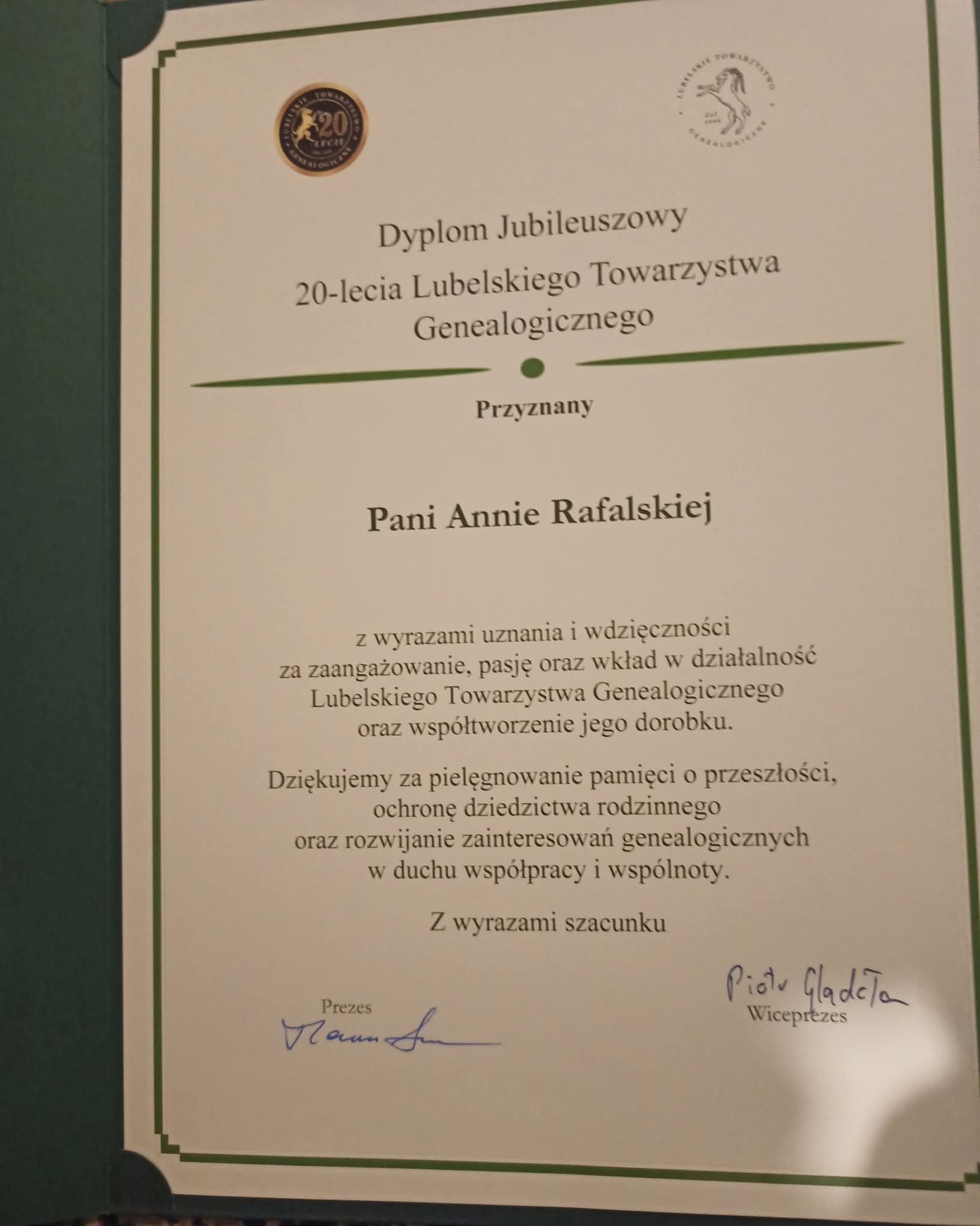 Po zakończeniu obrad odbyła się uroczystość wręczenia dyplomów i odznak jubileuszowych z okazji 20-lecia działalności Towarzystwa. Wyróżnienia te przekazano członkom LTG w uznaniu ich wkładu w rozwój organizacji, badań genealogicznych oraz ochronę dziedzictwa kulturowego Lubelszczyzny. Podczas uroczystości podkreślano znaczenie ich zaangażowania w budowanie i upowszechnianie wiedzy o historii rodzinnej i regionalnej.