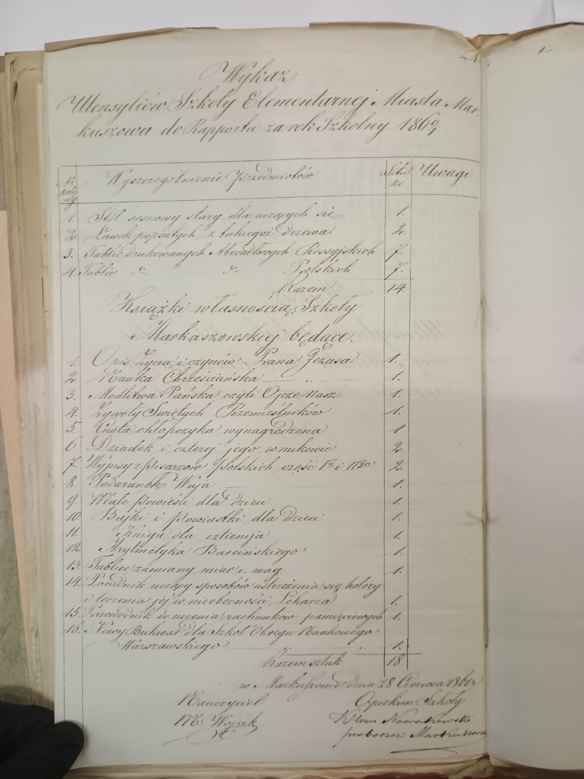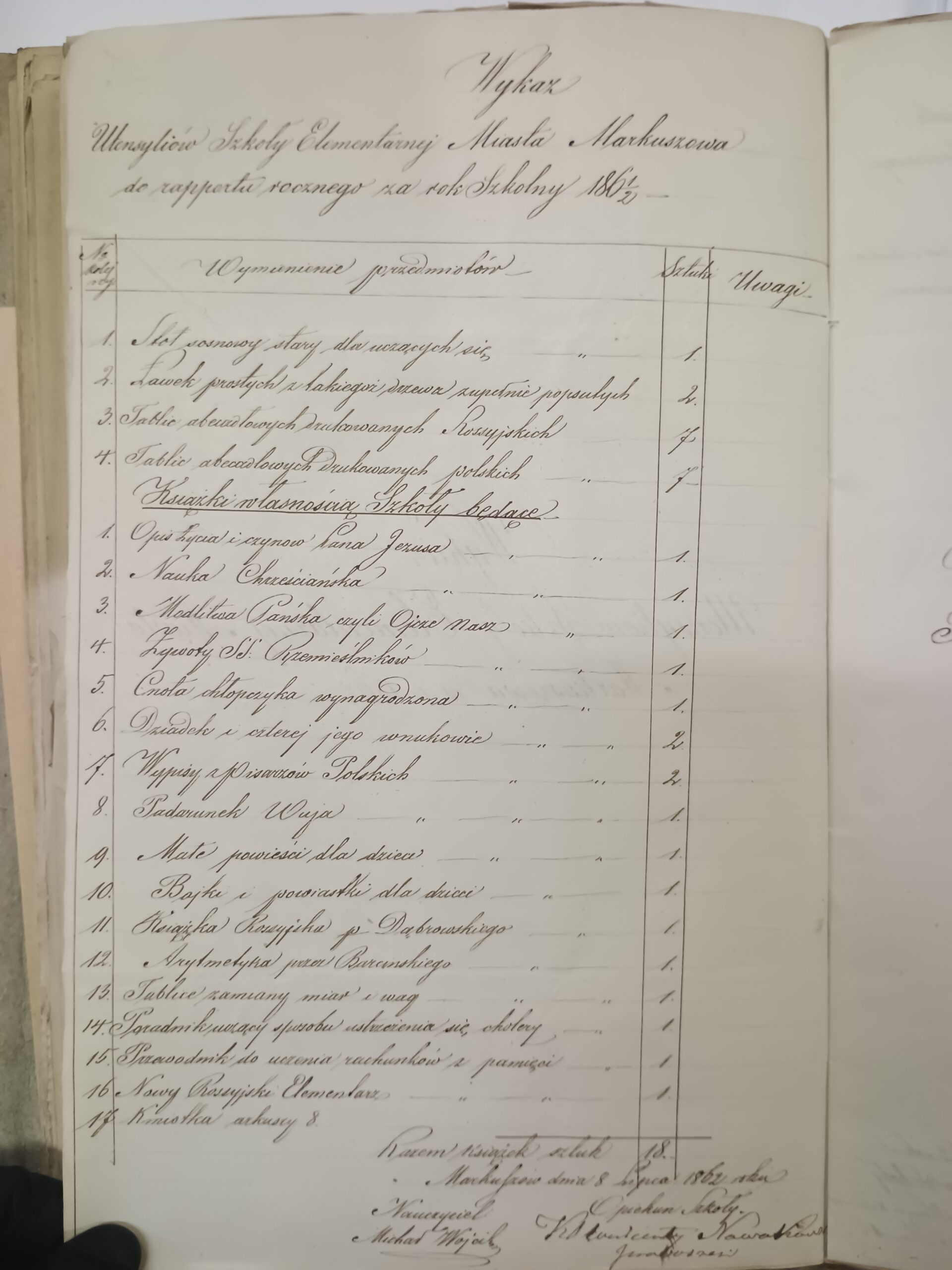 Tych ostatnich bardzo brakowało w lubelskich szkołach elementarnych, w tym i Markuszowie. Według zachowanych dokumentów wyposażenia, w szkole dosyć długo nie było żadnych zbiorów naukowych, a jedynymi meblami był duży stół oraz dwie ławki dla uczniów.  Już w 1836 r. opiekun szkoły – wikariusz parafii markuszowskiej ks. Wincenty Nowakowski informował, że książki nie mogą zostać sfinansowane przez rodziców, gdyż taki duży wydatek może poskutkować nie posyłaniem dzieci do szkółki. W raporcie za rok szkolny 1850/1851, wymieniono 14 sztuk tablic abecadłowych i 12 sztuk innych książek. Od tego czasu zapewne zasób książkowy szkoły powiększał się, o czym mogą świadczyć zachowane pełne wykazy utensyliów wraz z książkami z 1859, 1861 i 1862 r. Wyczytać z nich możemy tytuły książek o tematyce religijnej, bajki, powieści, książki do nauki języka rosyjskiego czy arytmetyki. Ponadto najzdolniejsi uczniowie otrzymywali nagrody w postaci własnej książki.