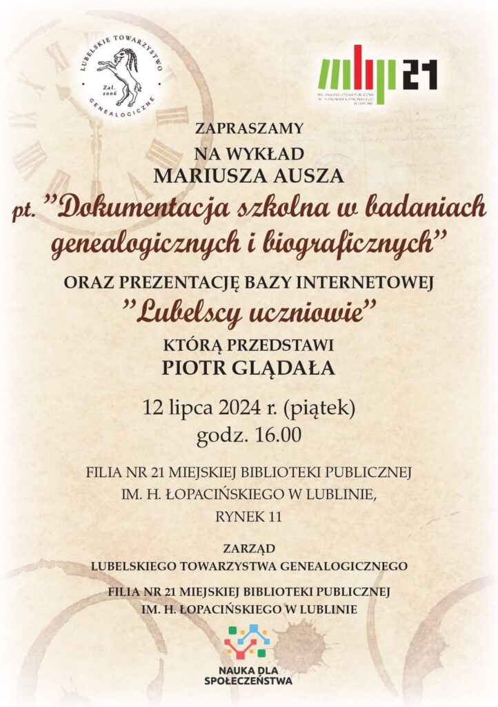PrzezRedakcja LTG12. Ogólnopolska Konferencja Genealogiczna „Geneami”, Brzeg, 27–28 września 2025 r. Podczas tegorocznej konferencji genealogicznej w Brzegu członkowie Lubelskiego Towarzystwa Genealogicznego, Piotr Glądała i Łukasz Mazurek, zaprezentowali projekt badawczy „Lubelscy uczniowie”, poświęcony wykorzystaniu dokumentacji szkolnej w badaniach genealogiczno-biograficznych. Projekt, zainicjowany w 2023 r. z okazji 250. rocznicy powołania Komisji Edukacji Narodowej, ma na celu popularyzację mało…